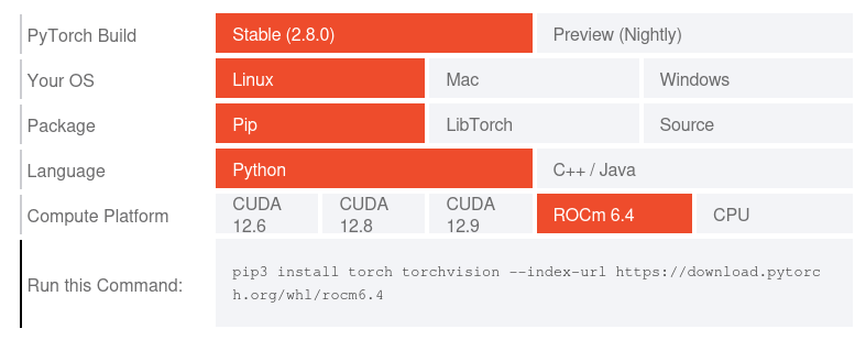 $ sudo apt install python3-pip python3.12-venv $ wget https://repo.radeon.com/amdgpu-install/6.4.3/ubuntu/noble/amdgpu-install_6.4.60403-1_all.deb $ sudo apt install ./amdgpu-install_6.4.60403-1_all.deb $ sudo apt update $ sudo apt install python3-setuptools python3-wheel $ sudo usermod -a -G render,video $LOGNAME $ sudo apt install -y rocm amdgpu-dkms