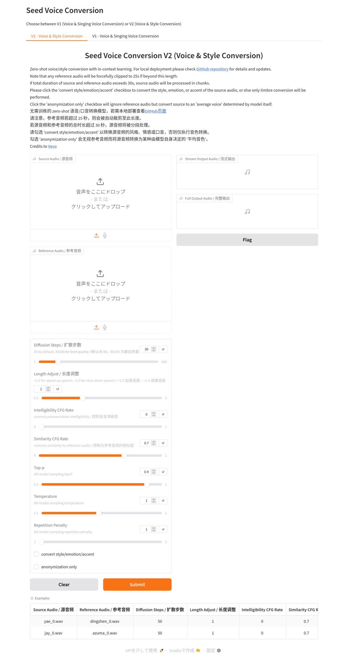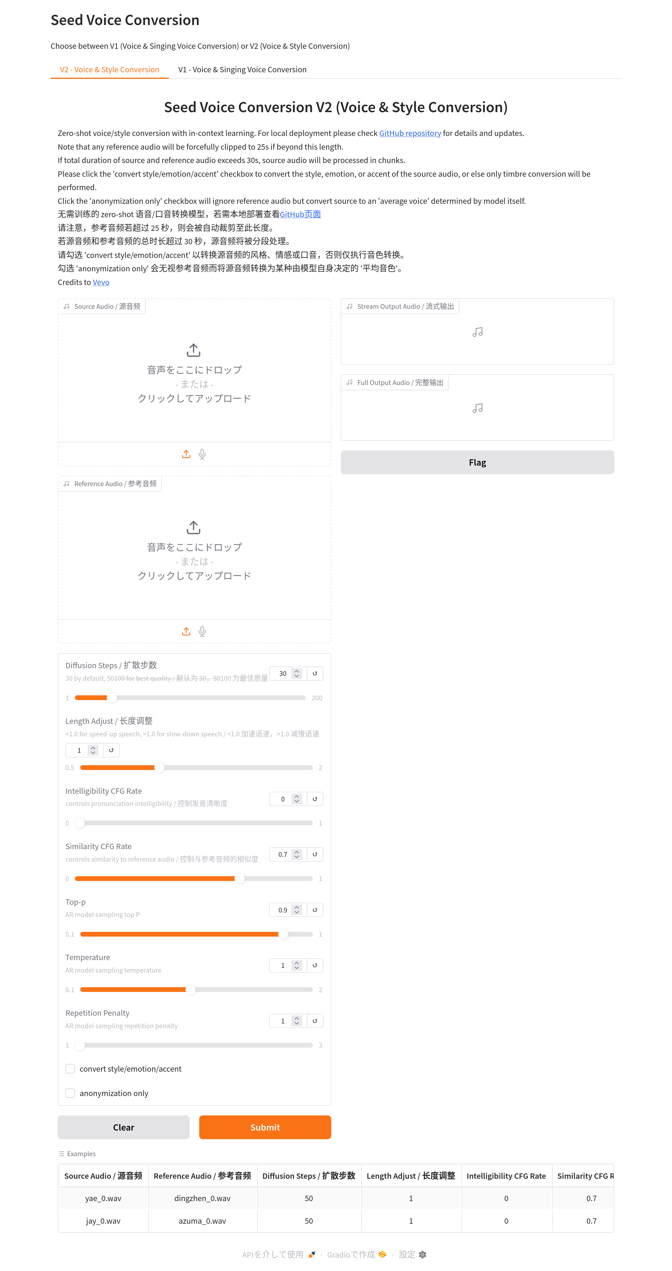 $ uv run app.py --enable-v2 --enable-v1 Loading V2 models... (中略) Loading weights from nvidia/bigvgan_v2_22khz_80band_256x Creating V1 interface... * Running on local URL: http://127.0.0.1:7860