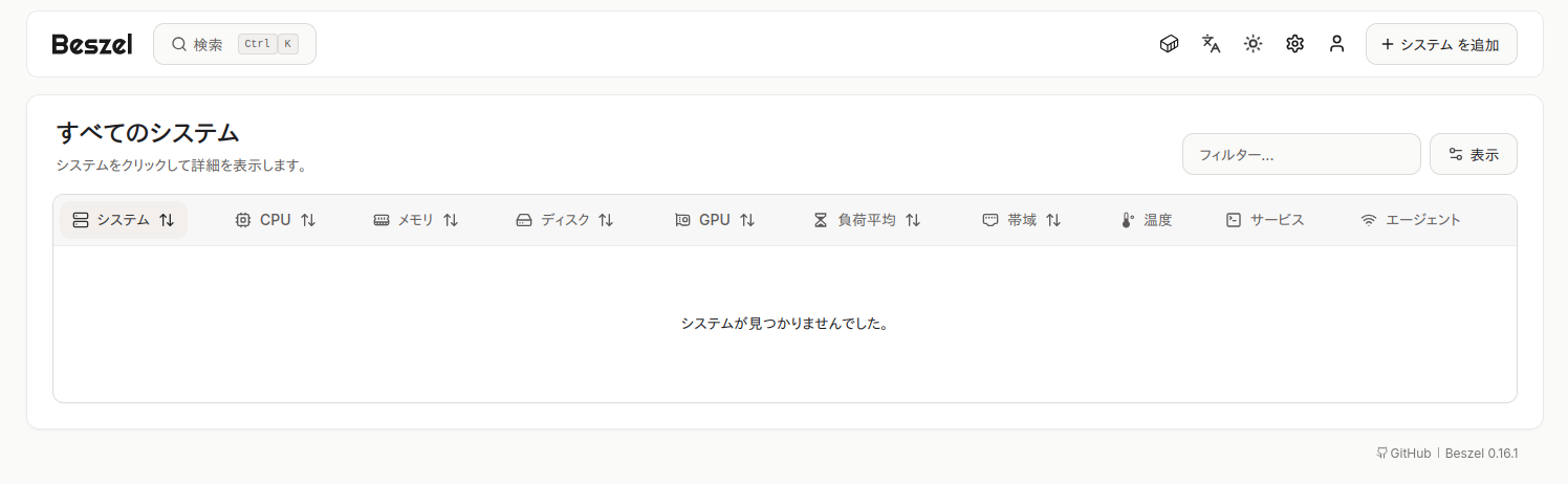 ただし、まだハブしか起動しておらず、エージェントが登録されていないため、何も表示されません。続いてエージェントを起動しましょう。