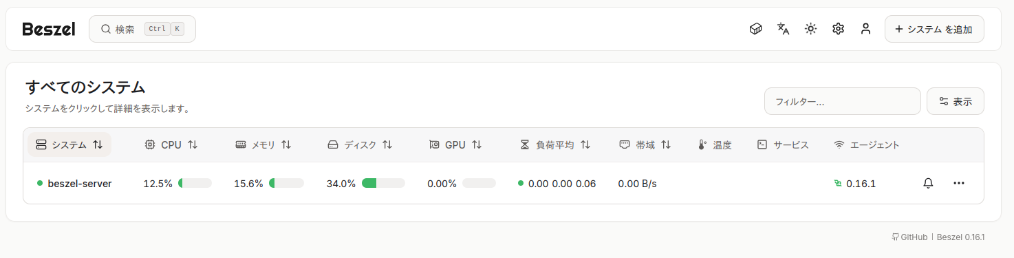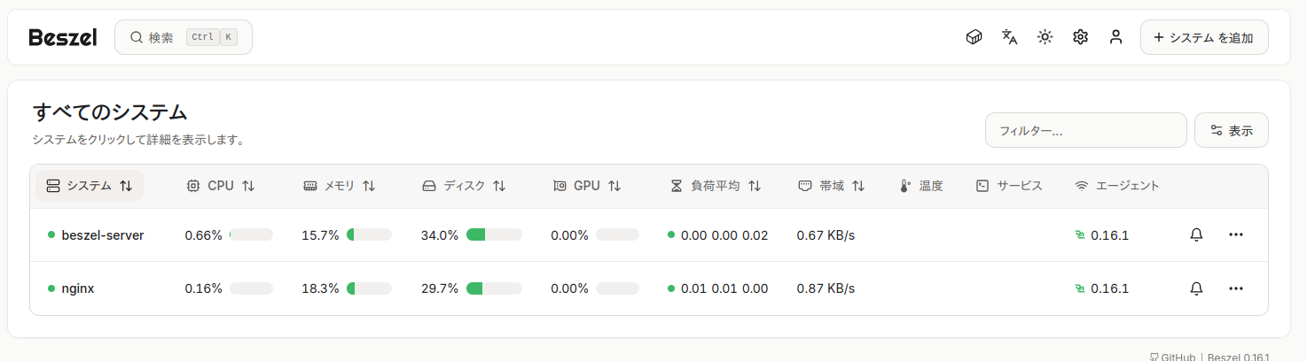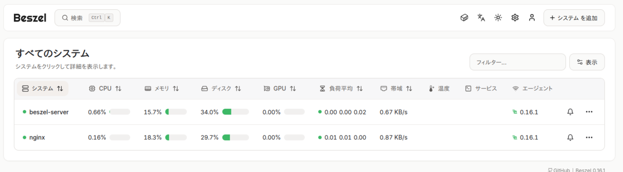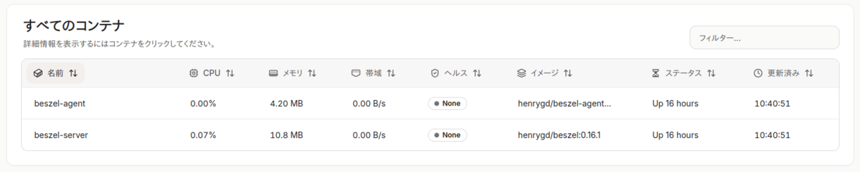 Dockerコンテナの監視に対応しているのも、今風です。今回構築したサーバーでは、ハブであるbeszel-serverコンテナと、自分自身を監視するbeszel-agentコンテナのふたつが起動しているため、以下のように表示されます。