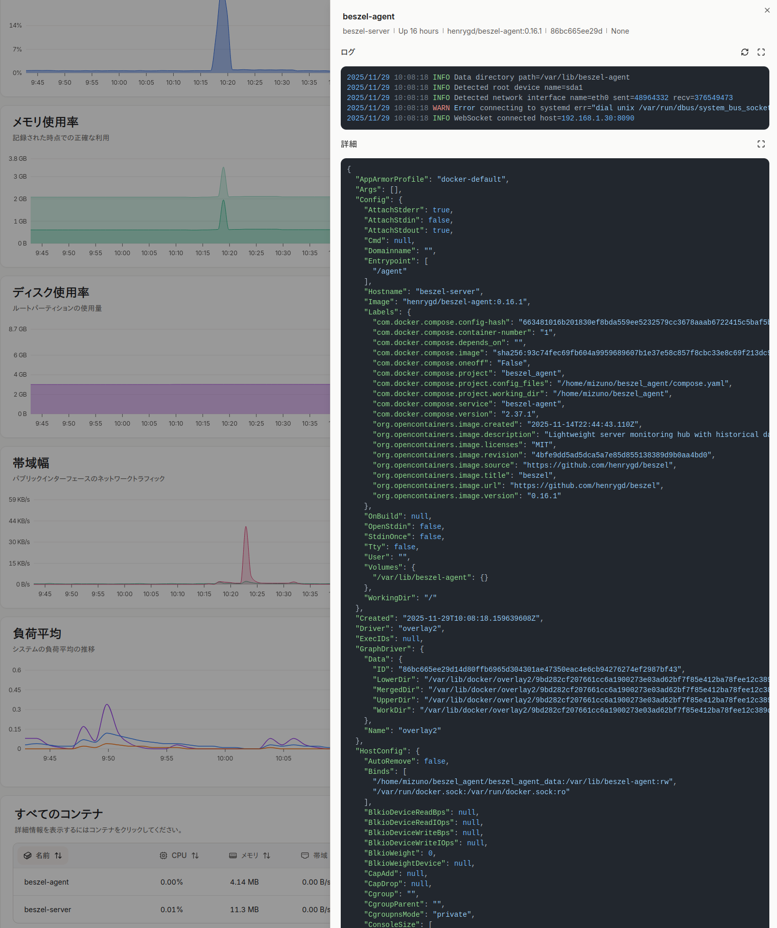 Beszelは個人の開発マシン、自宅サーバー、小規模な社内環境などに向いた、非常にシンプルな監視ツールです。Docker Composeだけで動かせるため、導入のハードルも非常に低く、また使い終わったらすぐに捨てられるため、一時的な利用にも向いています。開発環境にWebベースの負荷監視を一時的に入れたい、というような用途にぴったりでしょう。