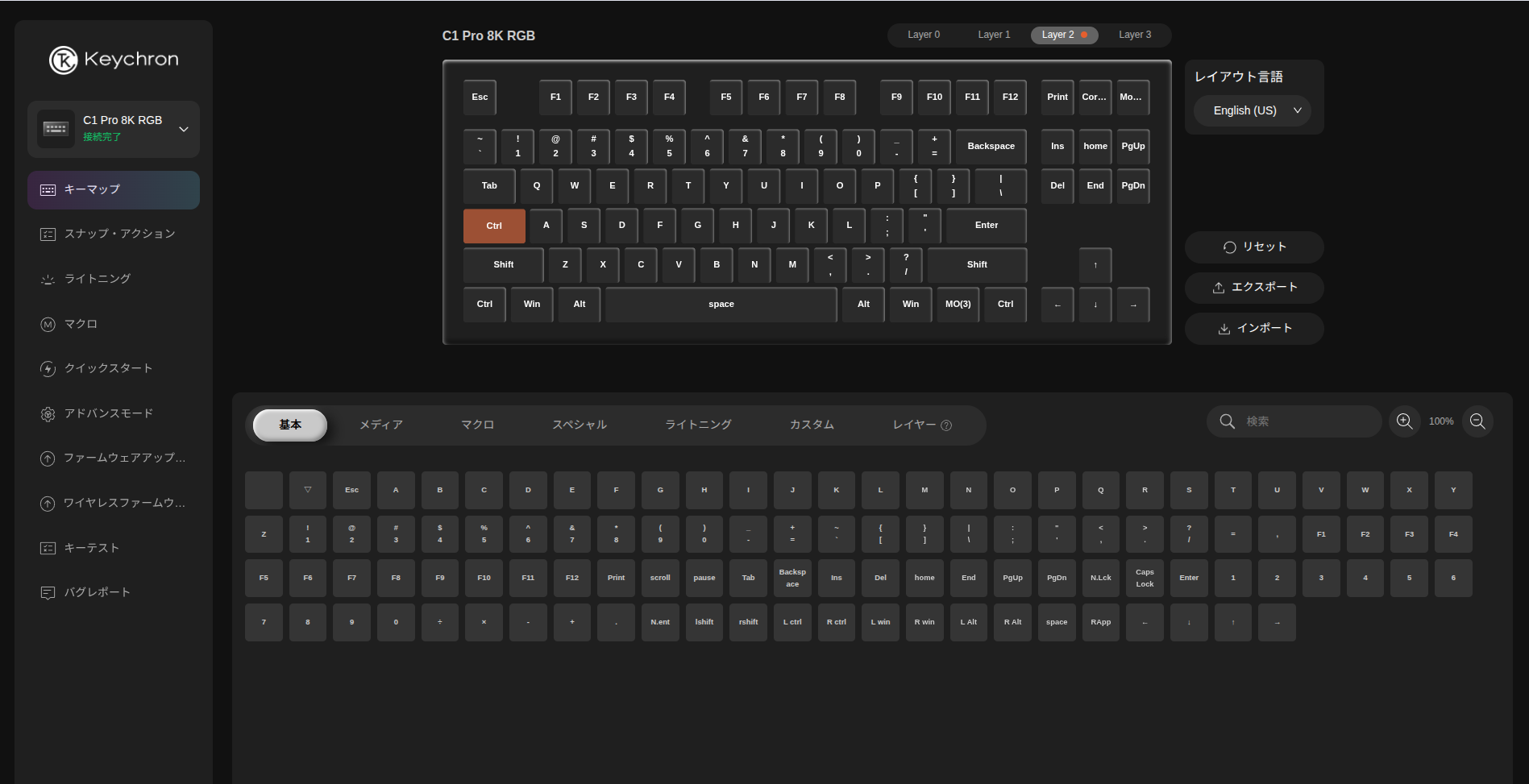 キーのリマップはWeb UIから簡単に行えます。まず定番のリマップとして、Caps LockをCTRLに変更してみましょう。左ペインから
