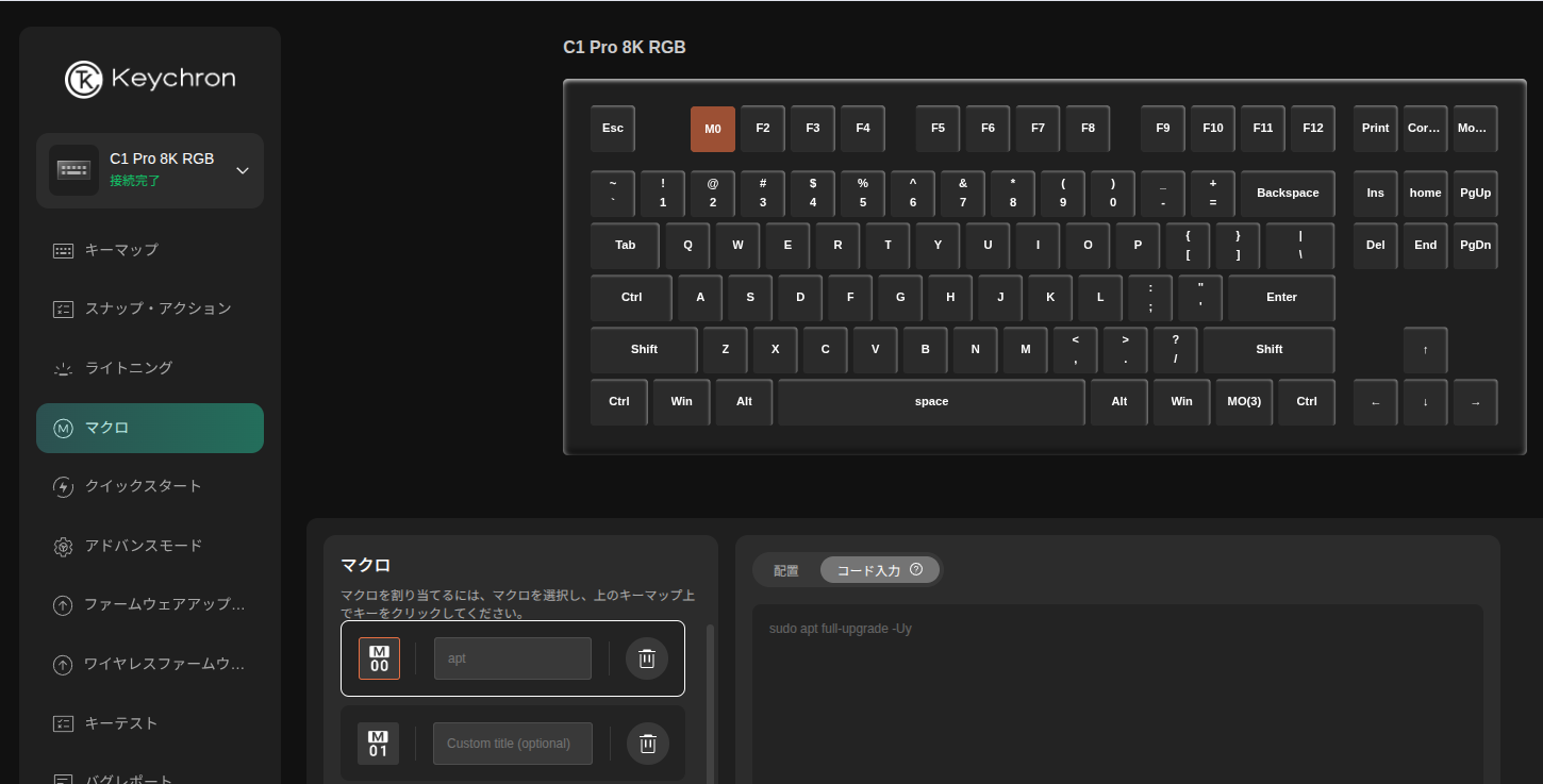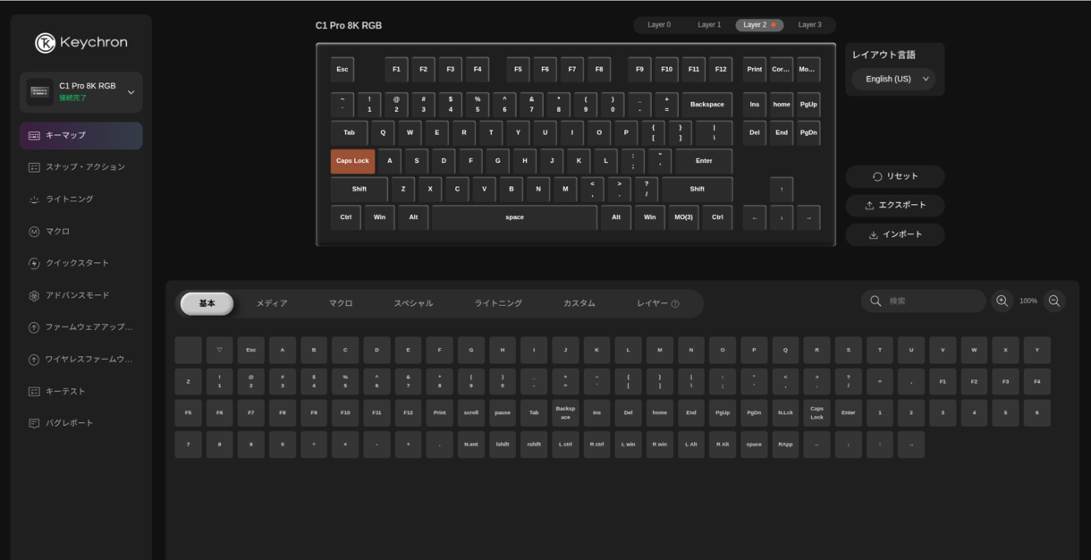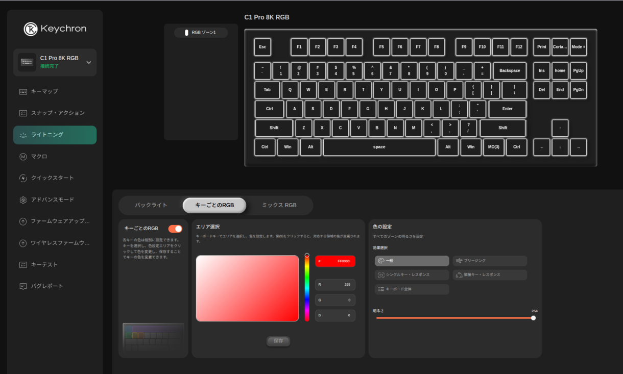 具体的にどのようなカスタマイズができるかは、キーボードのモデルにも依存します。Keychron Keychron C1 Pro 8Kでは、複数のキーコンビネーションをマクロとして特定のキーに登録したり、バックライトLEDの色をキーごとに調整できたりもします。