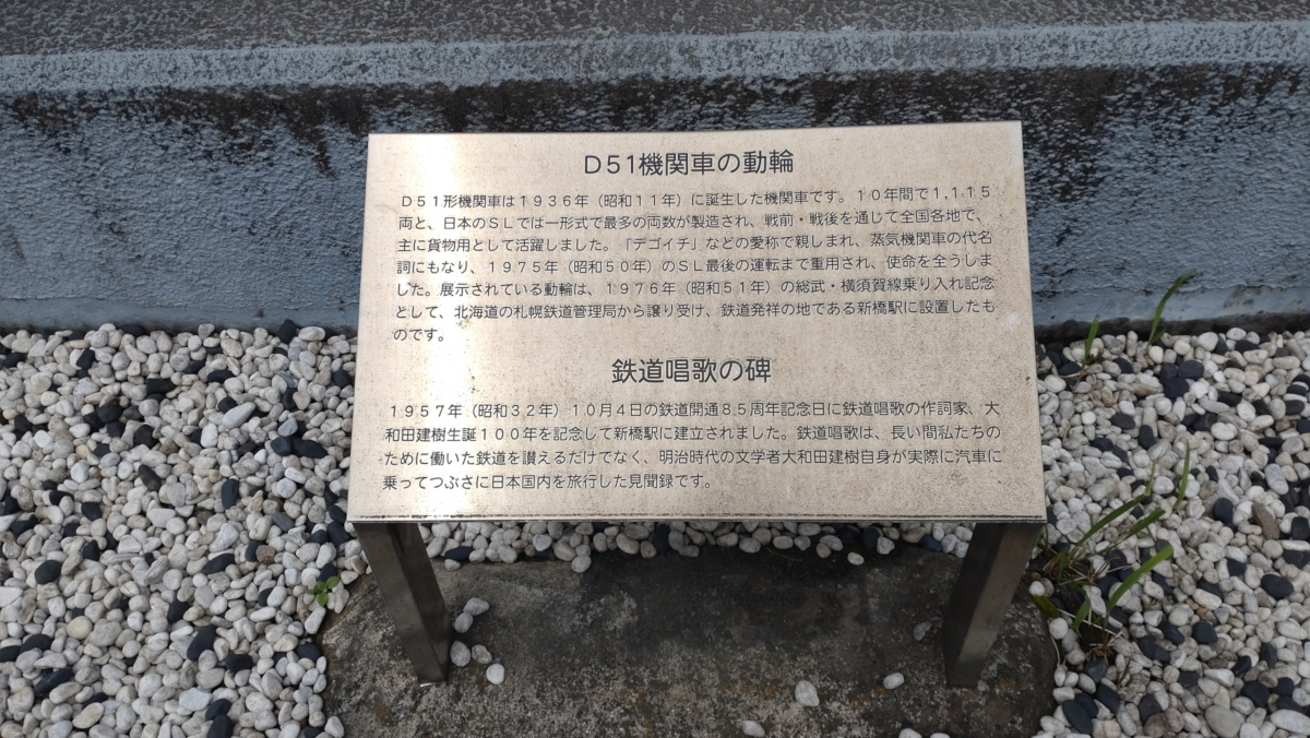 これはJR新橋駅にある動輪と鉄道唱歌の碑の説明です。筆者は対象物とその説明を連続して撮影し、後から見てそれが何か思い出せるようにする、ということをよくやります。
