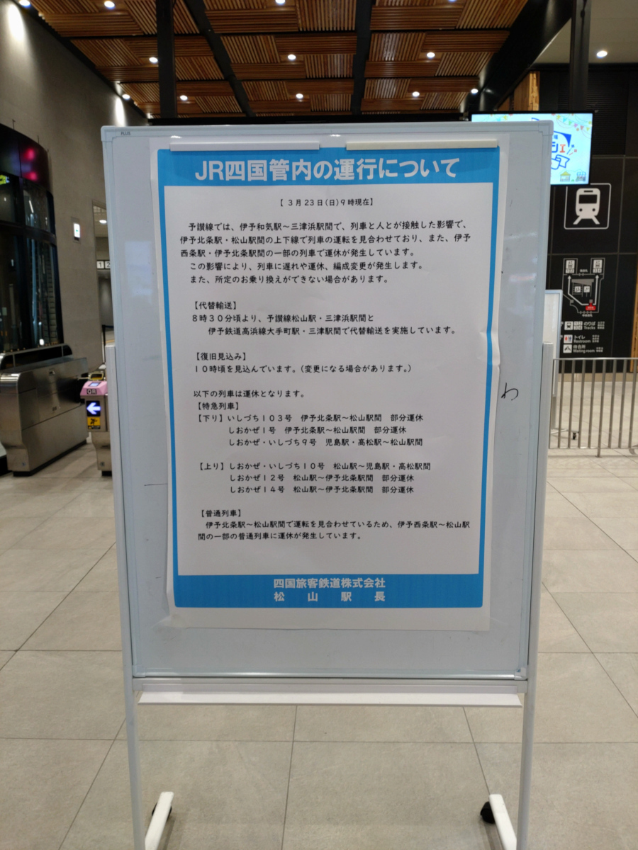 これは2025年3月23日にJR松山駅で撮影した運行案内です。特に影響を受けたわけではなく