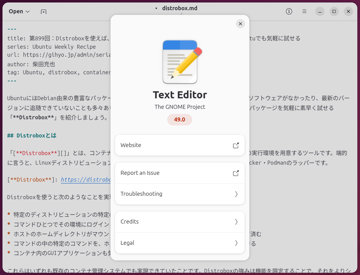実際にコンテナの中でGNOME Text Editorを起動してみましょう。