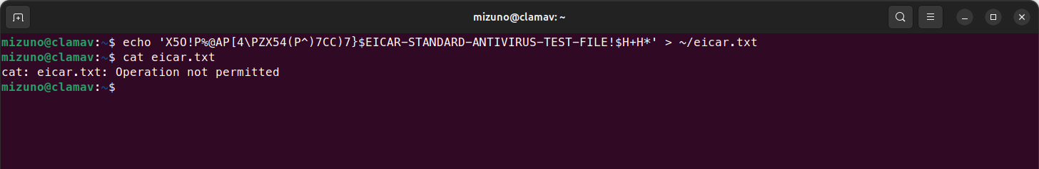 安全なウイルスのテストファイルであるEICARを使って、動作を確認してみましょう。ホームディレクトリに