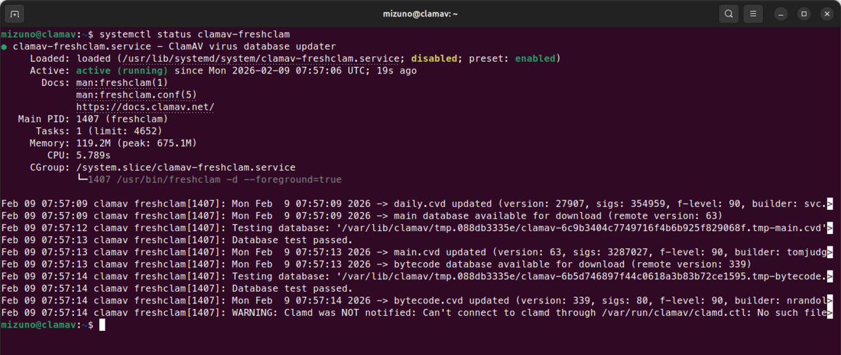 Ubuntuのfreshclamコマンドは、clamav-freshclamパッケージで提供されています。そしてこのパッケージにはsystemdのユニットファイルとして、freshclamをデーモンとして起動する