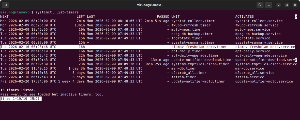 その上で、もしfreshclamを定期的に自動実行したい場合は、systemd.