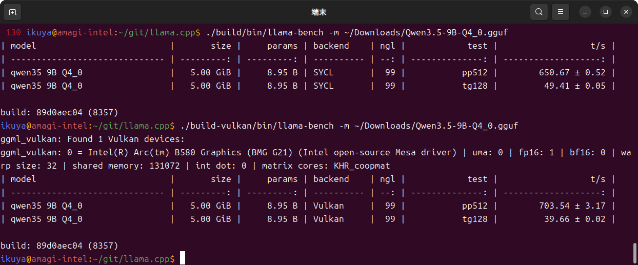 $ source /opt/intel/oneapi/setvars.sh $ ~/git/llama.cpp/build/bin/llama-bench -m ~/Downloads/Qwen3.5-9B-Q4_0.gguf $ ~/git/llama.cpp/build-vulkan/bin/llama-bench -m ~/Downloads/Qwen3.5-9B-Q4_0.gguf
