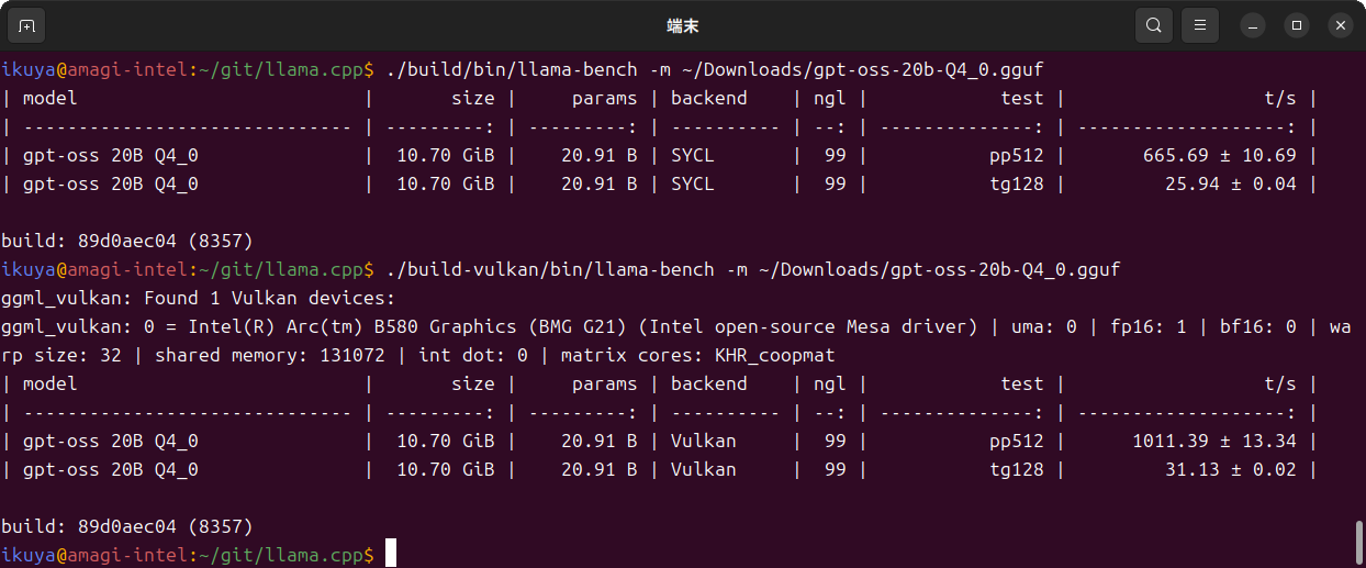 $ cd ~/git/llama.cpp/ $ source /opt/intel/oneapi/setvars.sh $ ./build/bin/llama-bench -m ~/Downloads/gpt-oss-20b-Q4_0.gguf $ ./build-vulkan/bin/llama-bench -m ~/Downloads/gpt-oss-20b-Q4_0.gguf