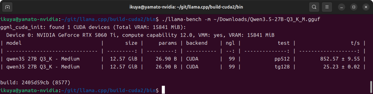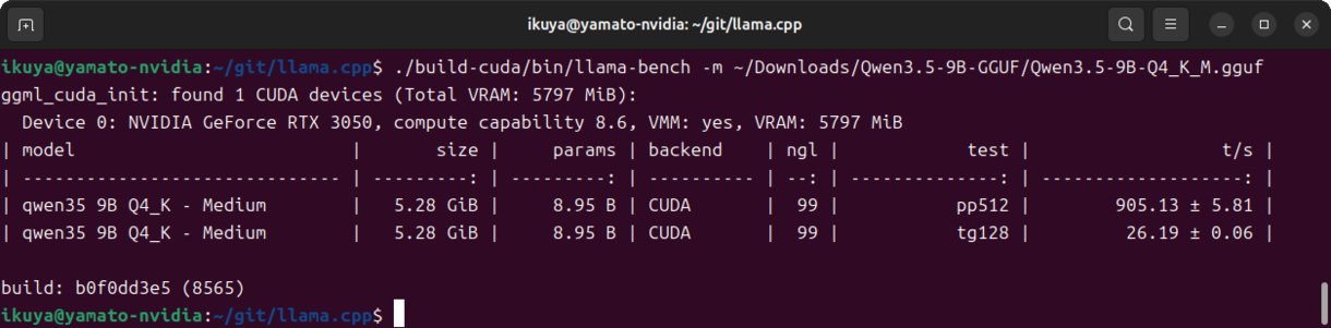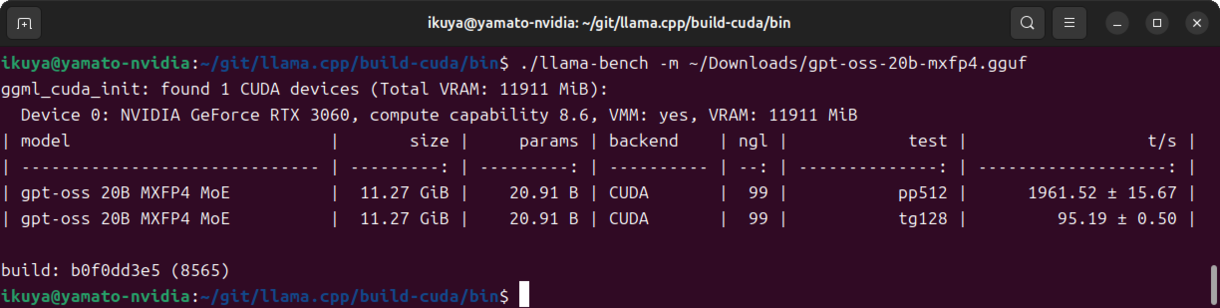 $ sudo apt install -y git git-lfs cmake g++ libcurlpp-dev $ mkdir ~/git $ cd ~/git $ git clone https://github.com/ggml-org/llama.cpp.git $ cd llama.cpp $ CUDACXX=/usr/local/cuda-13.2/bin/nvcc cmake -B build-cuda -DGGML_CUDA=ON $ cmake --build build-cuda --config Release -j 16