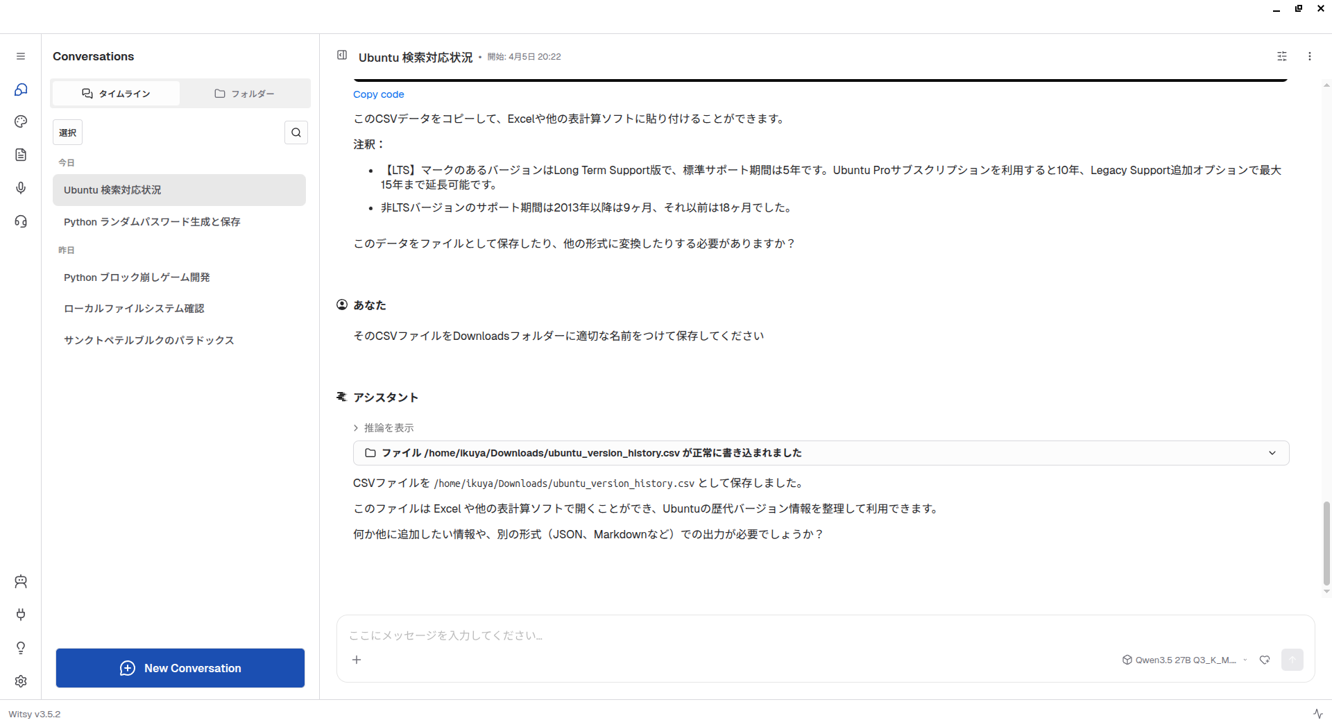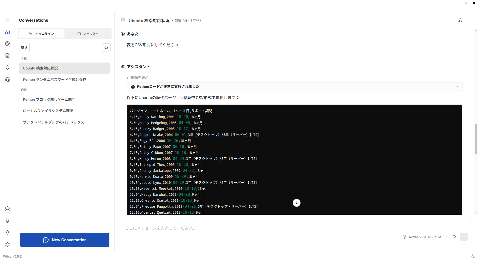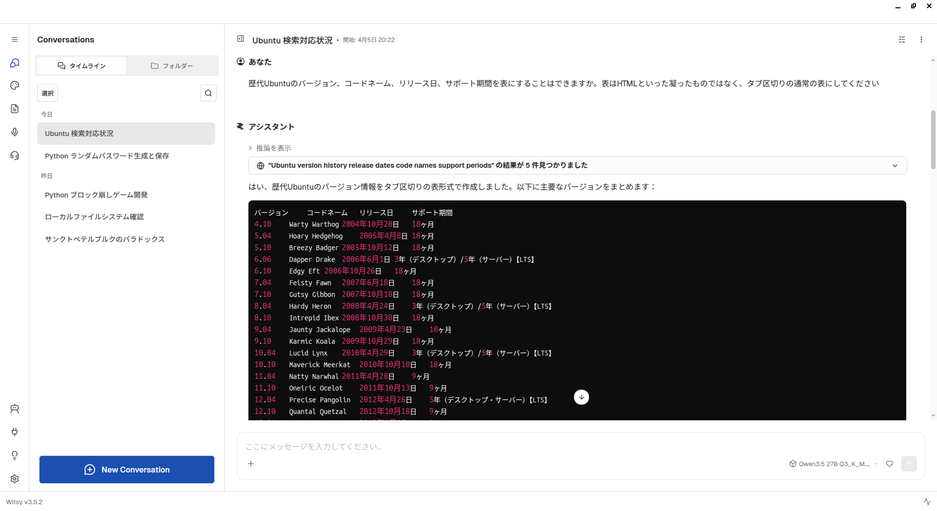 歴代のUbuntuのバージョンを検索結果から表にしてもらいましたが、筆者の記憶にある限りでは正確なので、きちんと検索できているようです