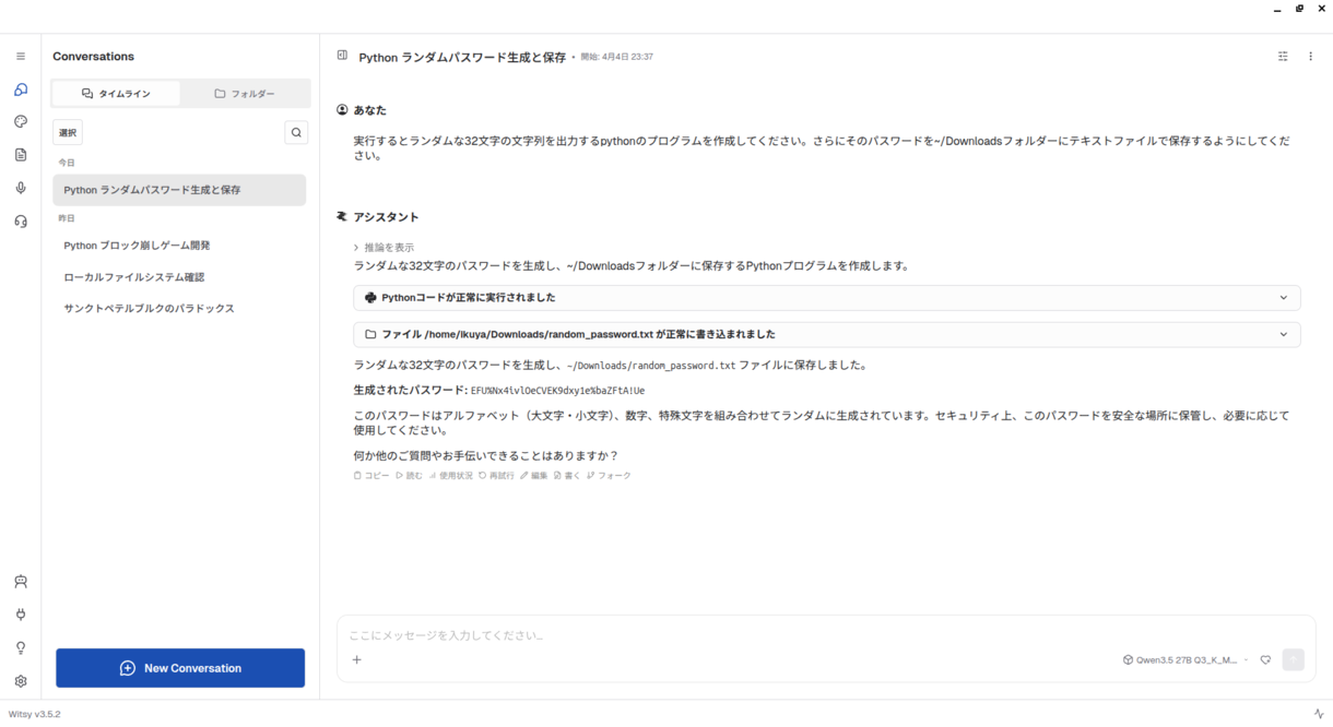 ダウンロード完了後、試しにランダムな文字列でパスワードを生成し、そのファイルを保存するPythonスクリプトを開発してもらいました