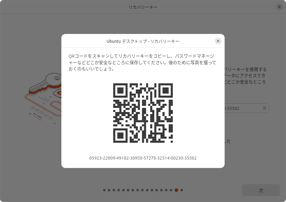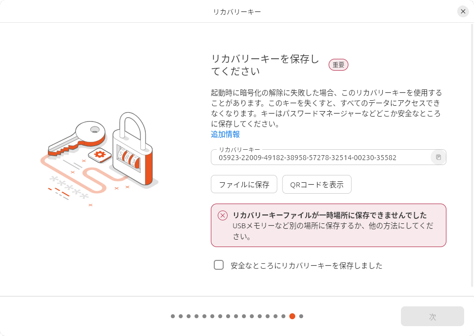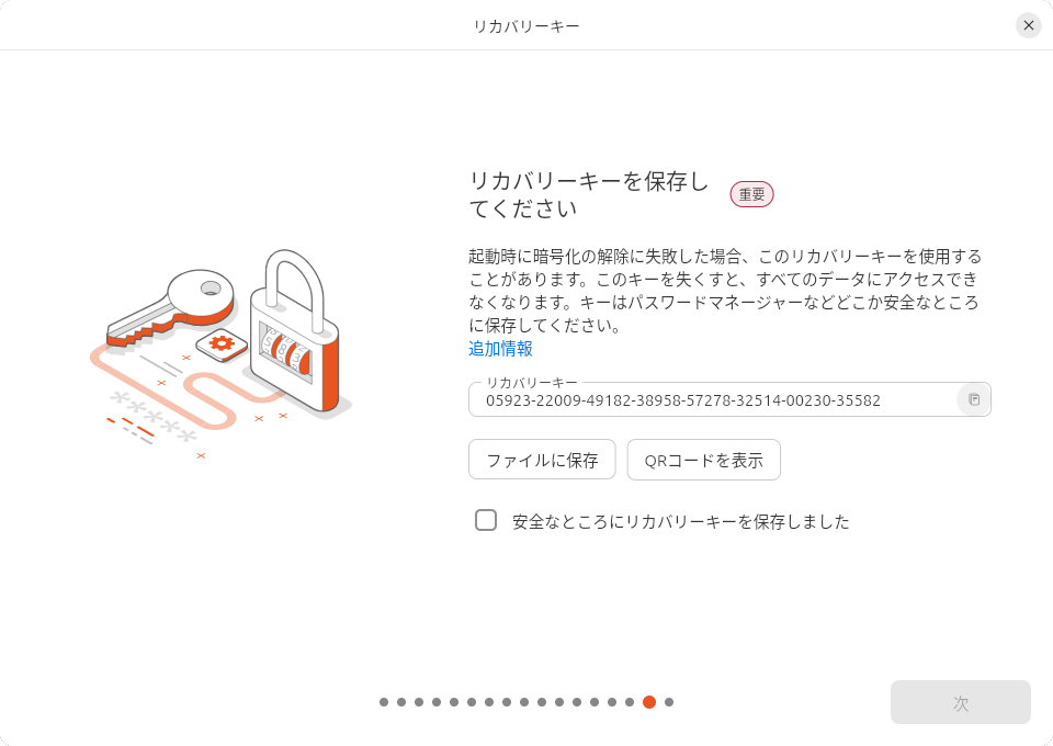 リカバリーキーをファイルとして保存するか、QRコードを表示するか、もちろん両方でもいいのですが、何らかの方法で保存します。