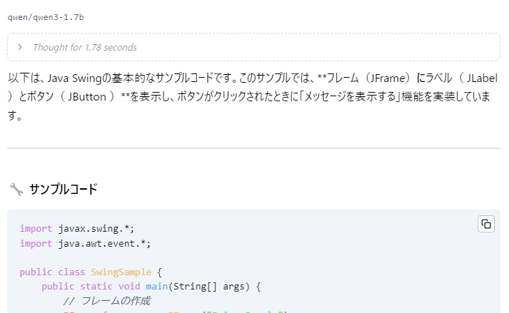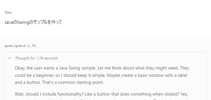 Qwen3はReasoningモデルといって、一旦Thinkingフェーズで考慮を行ってから返答を返すモデルになっています。現在のLLMはあくまで文章の続きを生成する仕組みなので、LLMの持つ知識を文章に書きだしておいてThinkingを開くと、何か英語で考え事をしていることがわかりますね。
