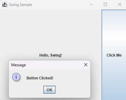 実際にはjava.のimportが必要なので、もう一度修正してもらうと、ボタンを押すとメッセージが表示されるプログラムが動きました。