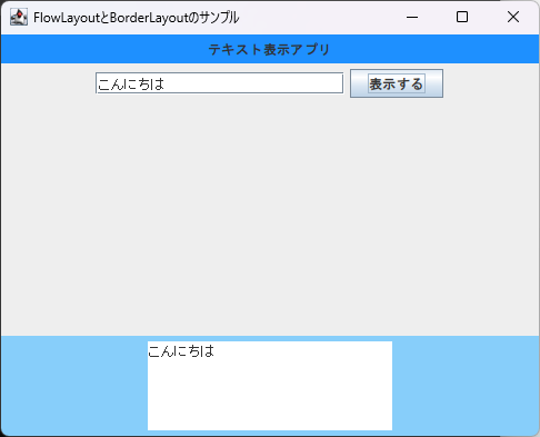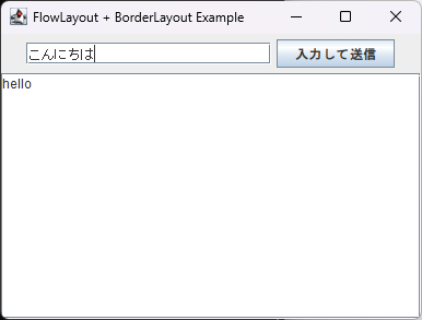 JavaのSwingでFlowLayoutとBorderLayoutを組み合わせて、ボタンを押すとテキストフィールドに入力した文字列がテキストエリアに表示されるサンプルを作って