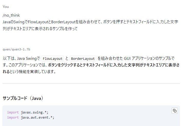 また、ここでシステムプロンプトに/no_を指定していますがQwen3以外のモデルを使う場合には不要です。