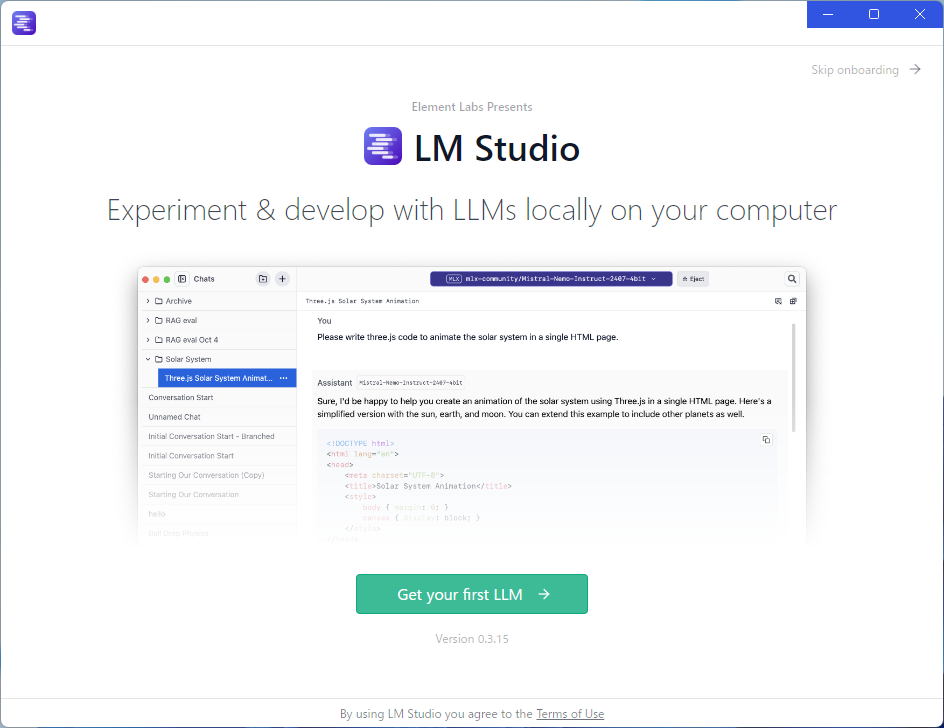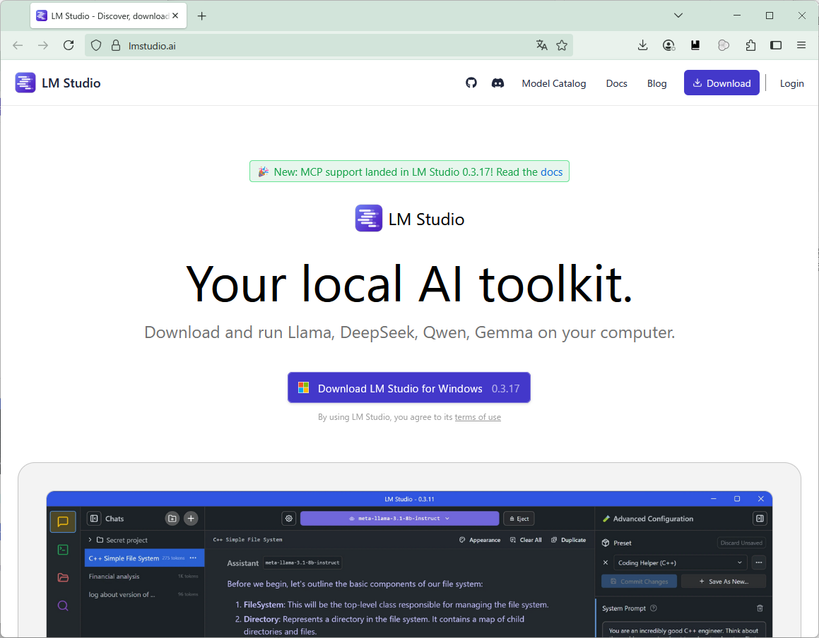 次のURLにアクセスして、LM Studioをダウンロード、インストールしてください。