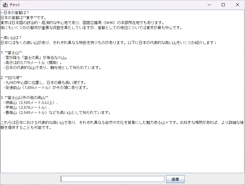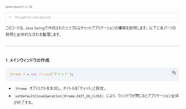 ただ、<think>~</think>を省こうとすると少し込み入った処理が必要になるので、今回はそのまま表示しています。