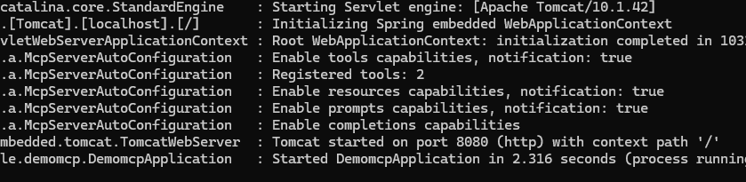 起動ログのうち、McpServerAutoConfigurationの部分がMCPサーバーに関するログです。