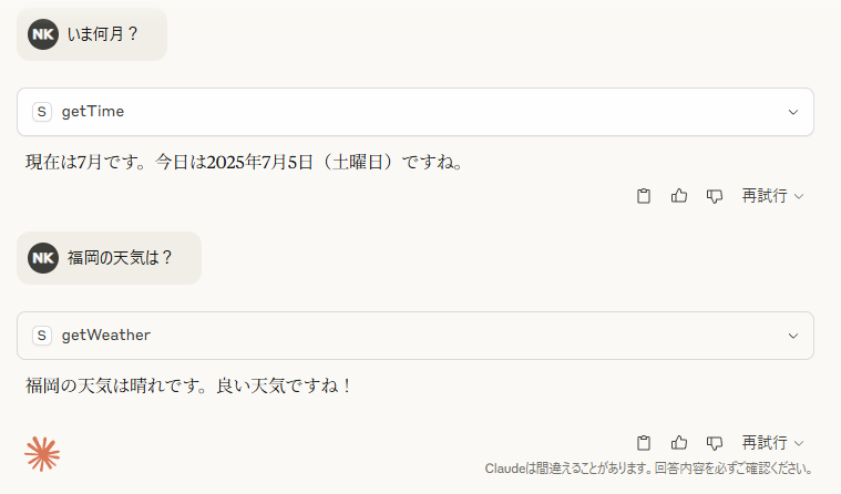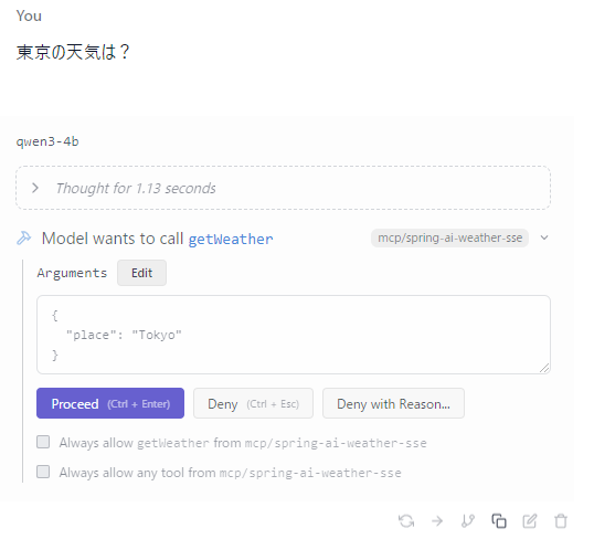 すると、MCPでのツール呼び出しを行うかを確認されます。