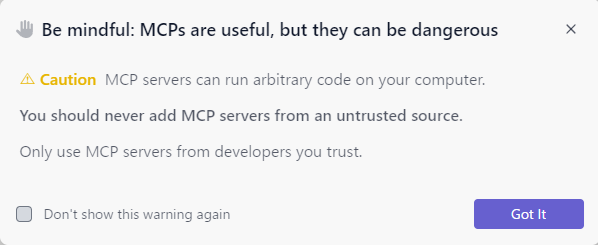 MCPでは任意のコードが実行できてしまうので、信用できないMCPサーバーを追加するなという警告が表示されますが、