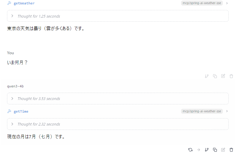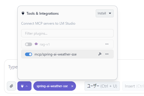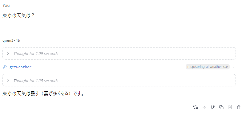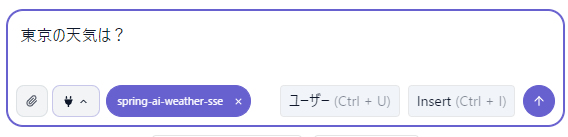 spring-ai-weather-sseが今回のMCPサーバーの登録名ということになります。他の名前でも構いません。SSE型の場合はurlを指定します。Spring BootでのMCPサーバーのパスは、sseになります。