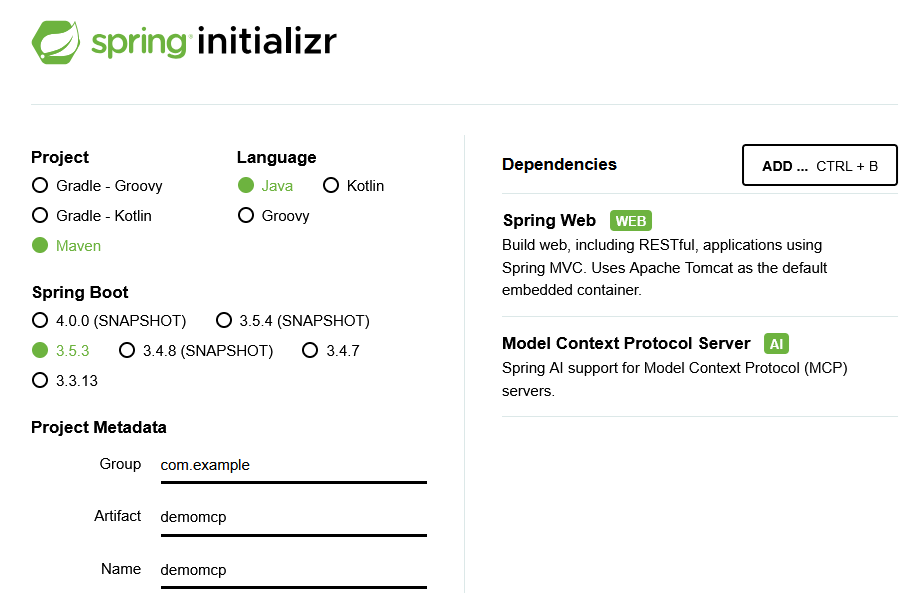 Spring Initializrで、Spring WebとModel Context Protocol Serverを含んだプロジェクトを作成します。Artifactは、ここではdemomcpとしています。