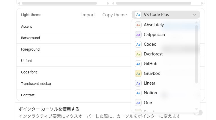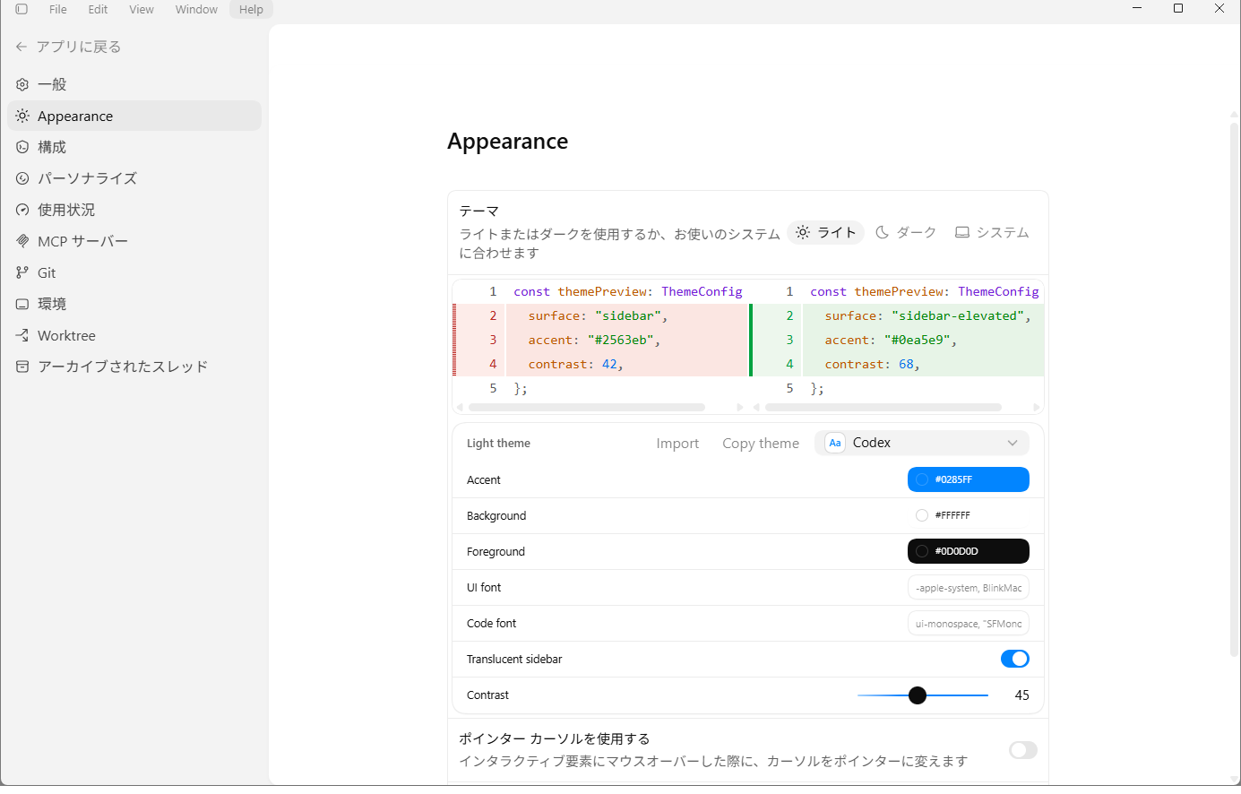 3月12日のCodexアプリの更新で、Codexアプリにテーマ機能が付いた。設定画面の