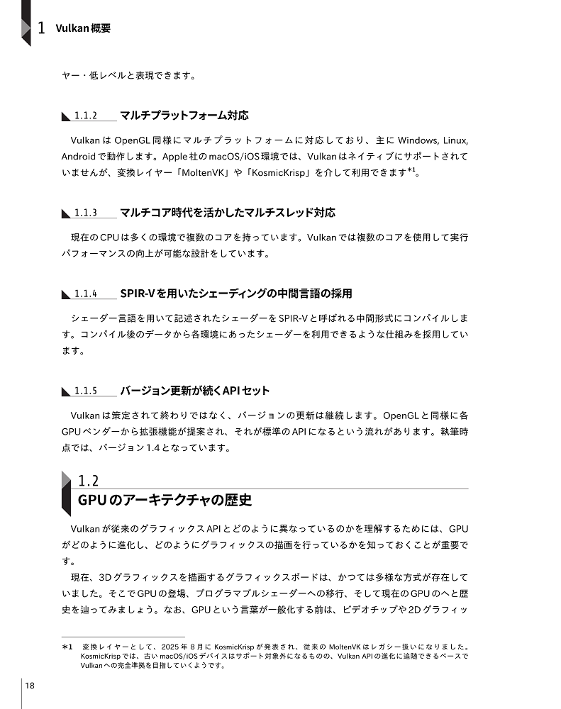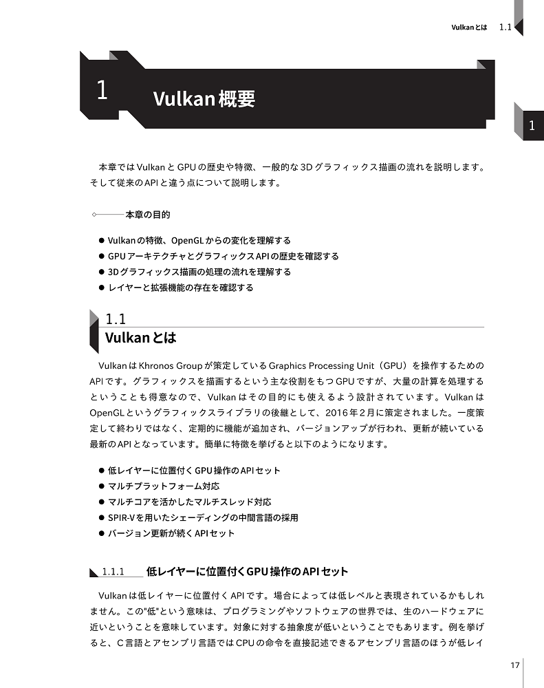 VulkanはOpenGLの後継として登場した次世代のグラフィックスAPIで、開発者がGPUをより細かく制御することで、従来以上にGPUの性能を引き出すことが可能です。UnityやUnreal Engineなどのゲームエンジンから内部的に利用されており、多くの開発者にとって普段意識することは少ないものです。しかし、⾼度なグラフィックスを実現する際やデバイスに最大限のパフォーマンスを発揮させる場合には、その知識が重要になります。またGPUを用いた汎用計算にも対応しており、シミュレーションやAIの分野での利用もあります。この書籍では、基本的な描画や計算処理を通じてVulkanを直接扱い、GPUグラフィックスプログラミングの基礎を学びます。