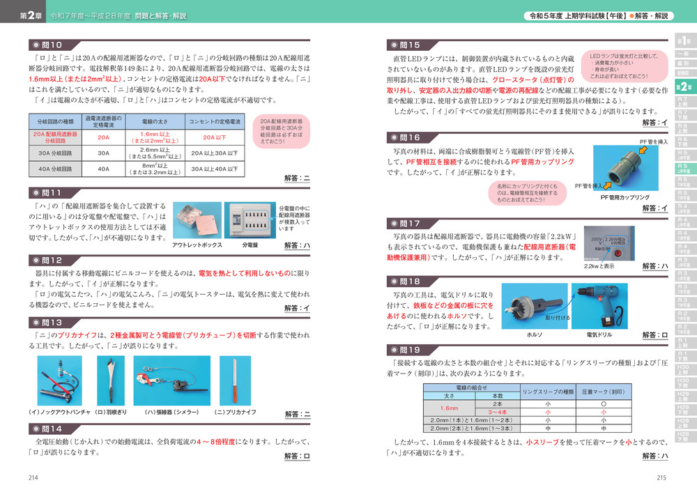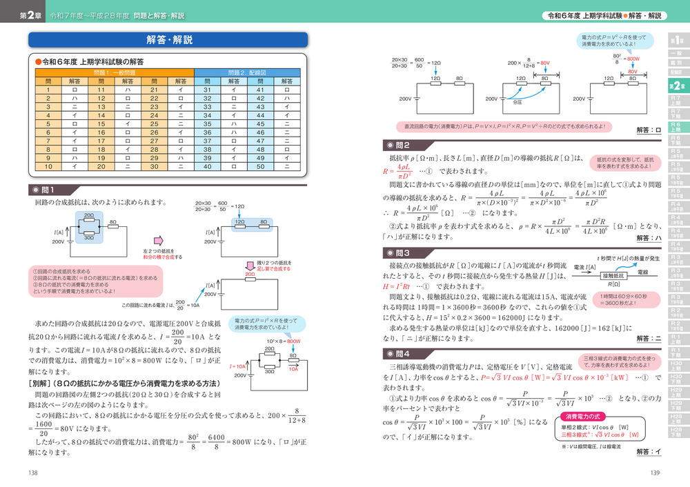 平成28年から令和7年までの10年間に出題された第二種電気工事士の学科試験問題(筆記方式)を全て掲載し、解き方を豊富な写真や図を使ってわかりやすく解説しています。全ページカラーなので、本番の試験さながらに学習できます。