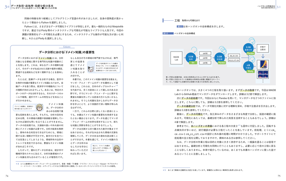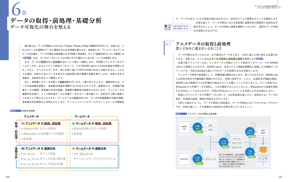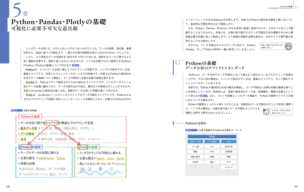 知識面では、数式やグラフの書き方よりも「なぜその形なのか」を解説します。たとえば「なぜ棒グラフは棒で、折れ線グラフは線なのか」。しくみを知ることで、情報の受け取り側に伝わる「表現」が身につきます。技術面では、データ分析・可視化分野のメジャー言語であるPythonに対応し、データは多くの人に馴染み深いマンガ・アニメ・ゲームを対象にしました。はじめての大規模なデータ処理も、自分の好きな作品のデータであれば宝探しのようなワクワクする作業へと一変するはずです。