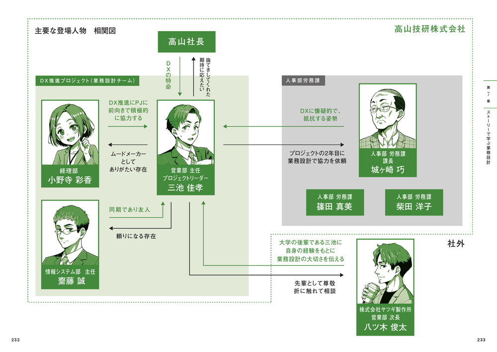 特徴3つ目が、「DXプロジェクトが主題のストーリーで理論の実践と定着を追体験できる」点です。本書の最終章(第7章)では、架空の中堅メーカー『高山技研』のDXプロジェクトを舞台にしたストーリーを通して、これまでに解説された業務設計の理論が、現場でどのように適用され、成功へと導かれるのかを追体験できます。