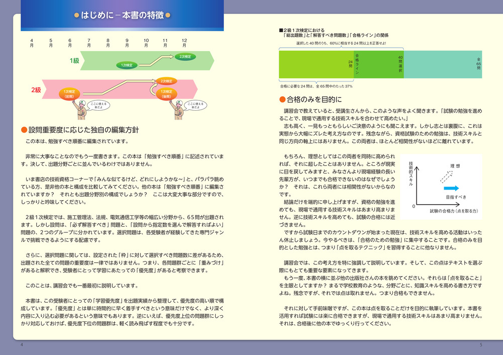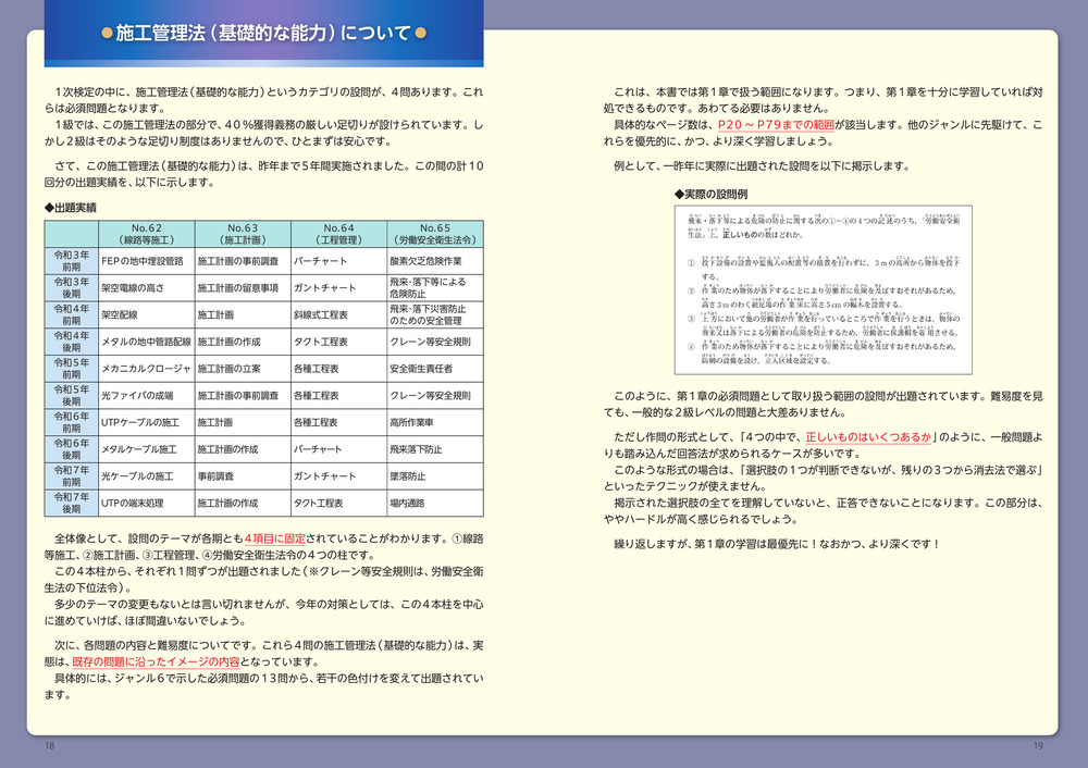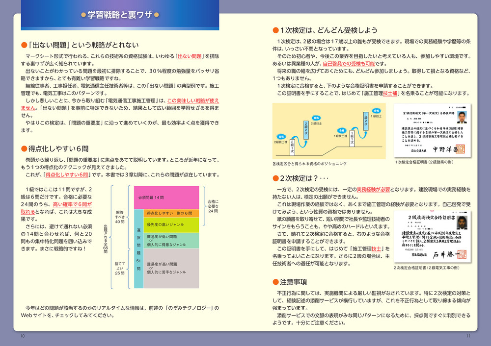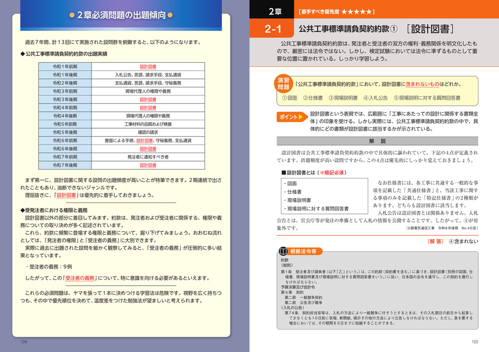 学習にあたっての優先順を把握できていますか? 電気通信工事の施工管理技士を目指す登竜門が、2級の1次検定です。合格すれば、秋の2次検定へと進むことができます。しかし受験者の半数が、まずはこの1次検定で振り落とされます。本書は、避けて通れない必須問題や、先行して取組むべきジャンル、出題頻度の高い分野を優先的に編集した受験対策の攻略本です。さらには、テキスト→問題集の順で進めがちな古い勉強法を脱し、これらを1冊で済むような構成にしました。