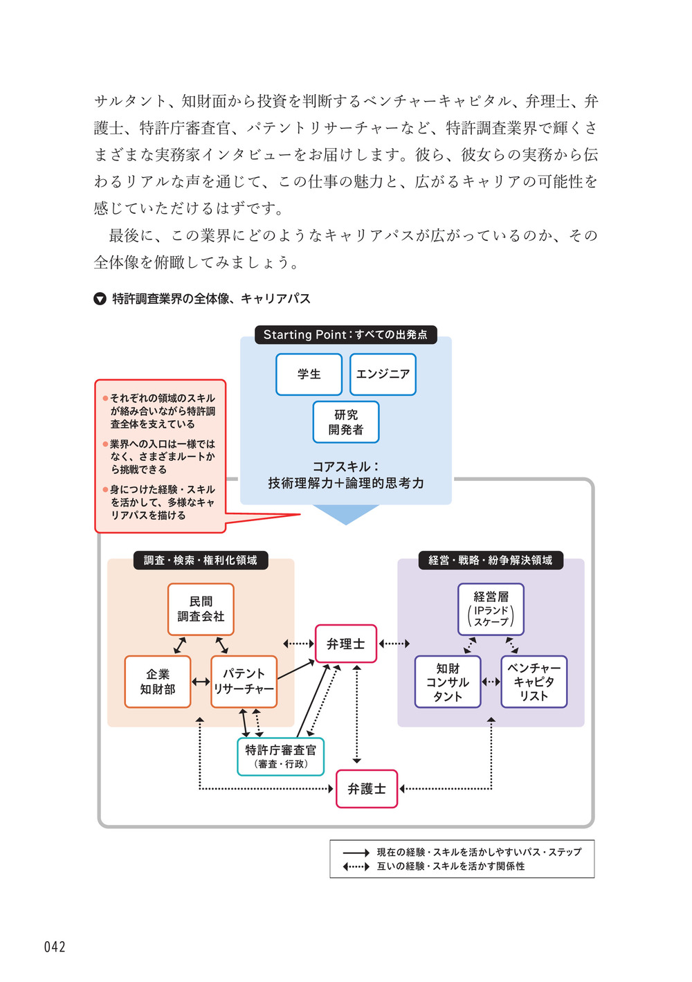 次に、企業知財、調査会社、弁理士・弁護士、知財コンサル、ベンチャーキャピタル(VC)、特許庁など第一線で活躍する実務家への取材を通して、この仕事のリアルを紹介。