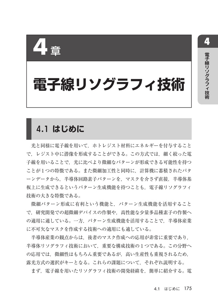 限界といわれながら半導体集積回路の高集積化の勢いが止まらない。この高集積化を牽引するリソグラフィ技術に関し、その基本から応用まで詳述する。光リソグラフィ技術の解像限界を突破するマルチパターニング技術から、最先端微細加工を実現するEUVリソグラフィ技術の最新状況を紹介する。さらにマスク作製を一変させたマルチビーム型電子線描画装置の最新状況や、超微細な構造を実現するナノインプリント技術の最新状況まで述べている。