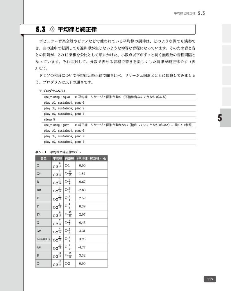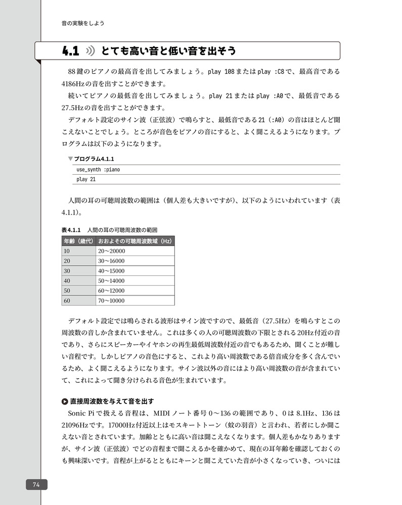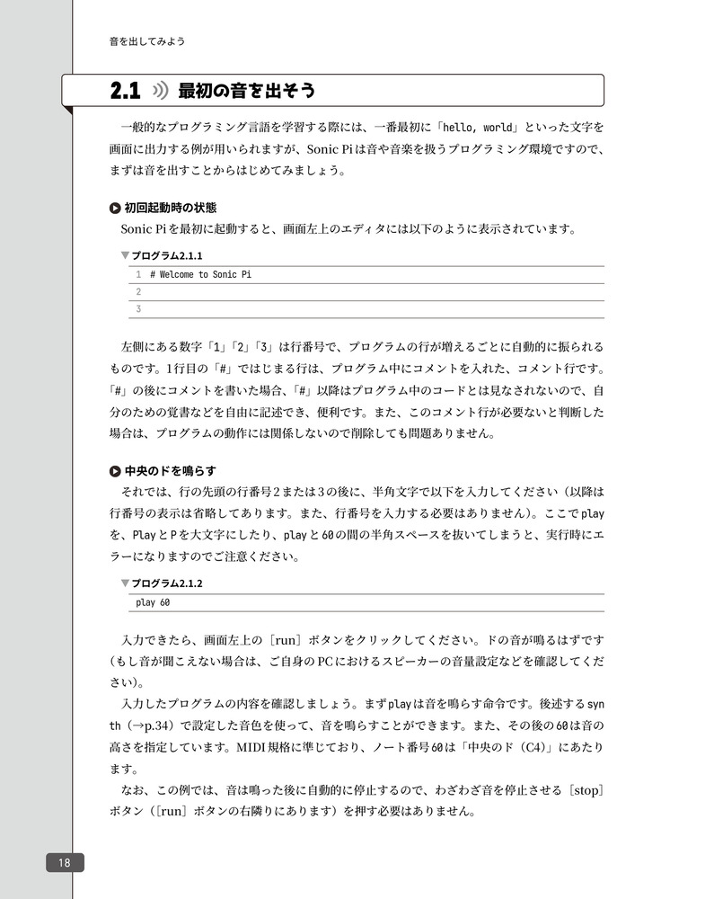 本書は、音と音楽のためのプログラミング言語「Sonic Pi」の基礎から応用までを網羅した解説書です。Sonic Piは、英ケンブリッジ大学の研究者Sam Aaron氏によって、教育およびライブコーディング(プログラミングによる即興演奏)のために開発されました。Sonic Piは「play 60(中央のドを鳴らす)」という極めてシンプルな記述からはじめられるため、プログラミング未経験者でも無理なく取り組めます。さらに本書は、数学的・科学的なアプローチによる高度な音作りまで、深く学べる内容となっています。