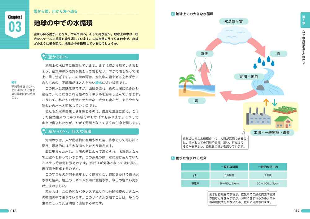 私たちの生活に水は欠かせません。キッチンや風呂、トイレなど、暮らしの中で使う直接的なものから、食べ物を生産するために必要な農業用水、様々な製品製造で使われた工業用水など、ありとあらゆるところに水が関わっています。こうした水はどのように作られるのか、そして、使ったあとはどのように処理され綺麗になるのか。本書では、これら水処理のしくみを、図解を交えて丁寧に解説します。さらに、半導体製造に必要な超純水、水処理におけるAIの活用など、最先端の技術まできちんと学べます。これから水処理を学んでいくにあたり、一番初めに読みたい1冊です!
