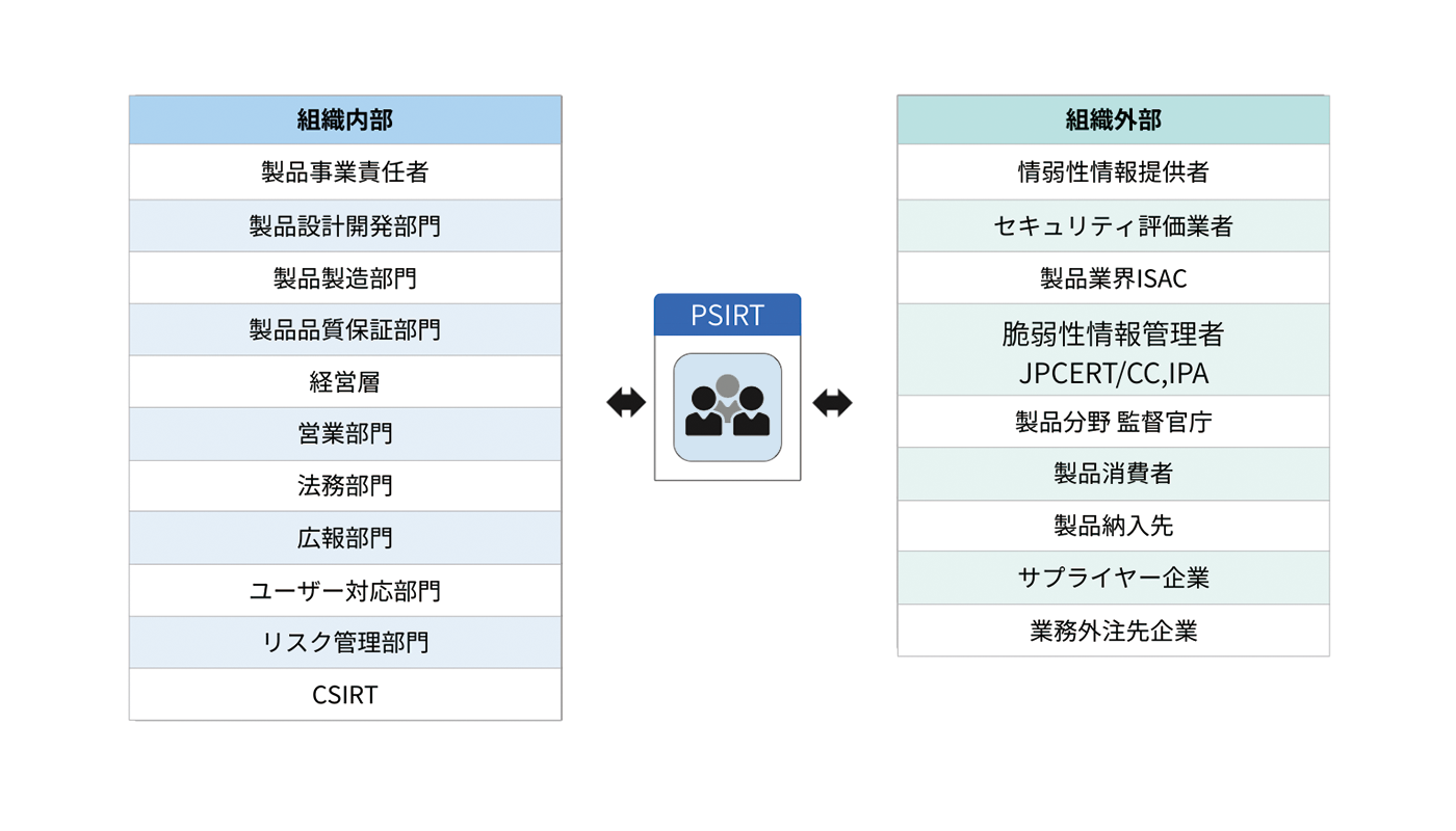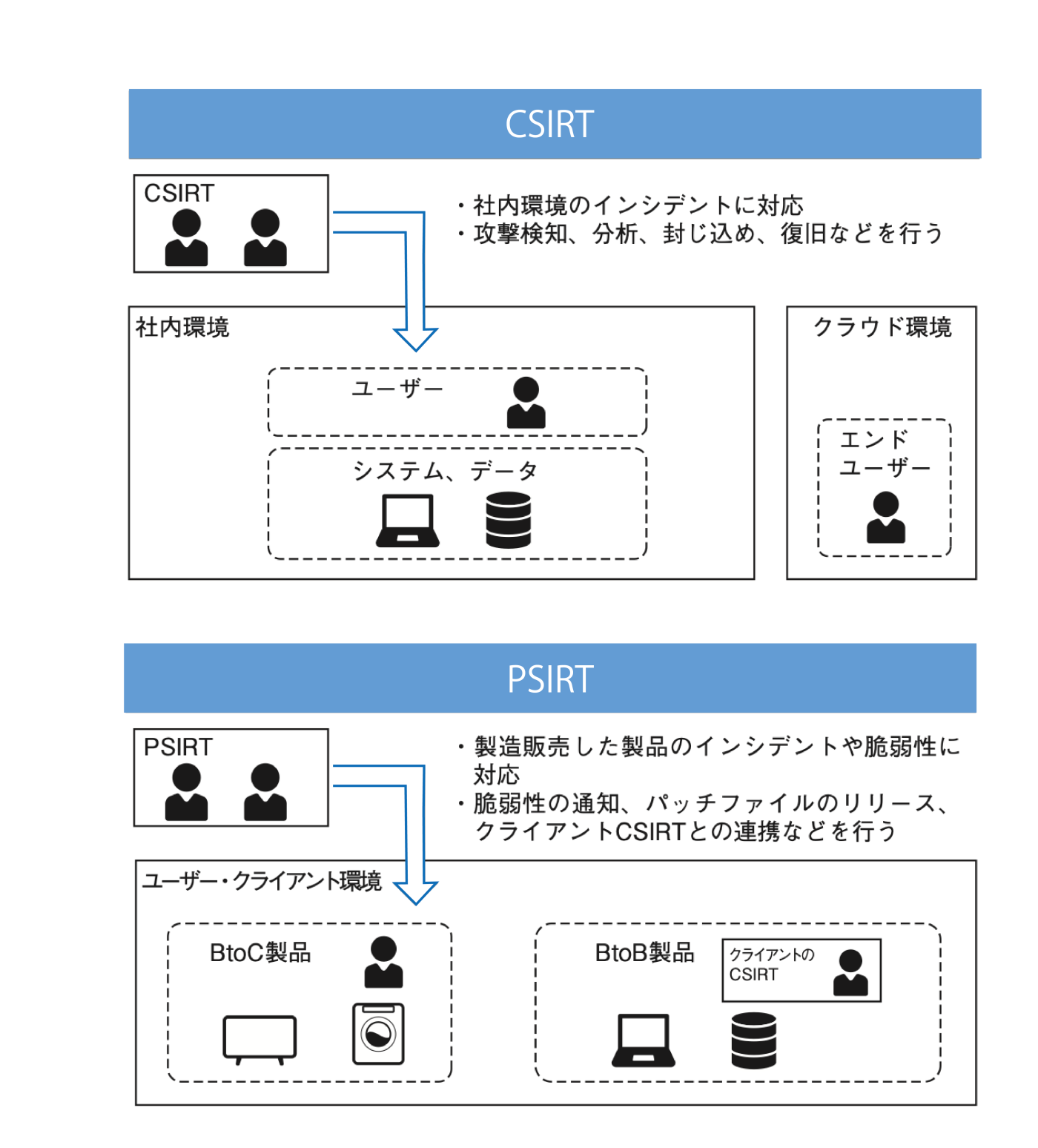 CSIRTは、主に社内の情報システムを対象とし、セキュリティインシデントが起きた際は、対応を行います。一方、PSIRTは製造または販売する製品のセキュリティインシデント対応を専門に行います。製品のセキュリティを扱うことから、自社の品質保証部門や製品開発部門、運用保守部門、社外のステークホルダーなど、多くの関係者と連携する必要があります。