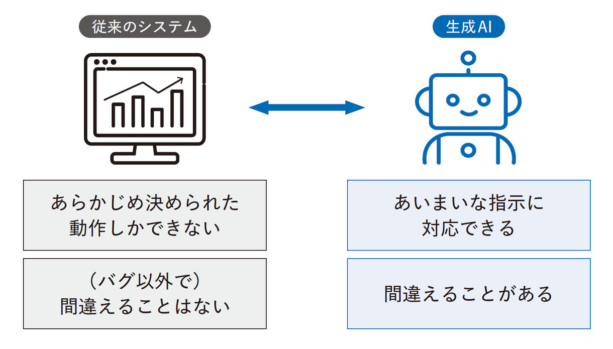 従来のシステム、つまりルールベースのプログラムは正確性が重要でした。たとえば、Excelで売上集計をする場面を考えてみてください。関数が1つでも間違っていれば、数字はすべて狂ってしまいます。クライアントに提出する資料で合計金額がズレていたら、それは致命的です。こうした業務では、