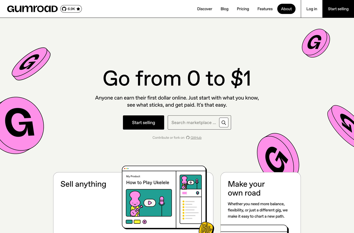 図34 クリエイターが作成したイラストや電子書籍、音楽や動画などのデジタルコンテンツを販売・購入できるプラットフォーム、Gumroadのウェブサイト