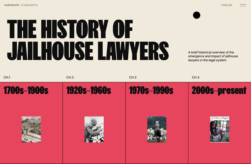 図43 JLI(The Jailhouse Lawyer Initiative)による、18世紀から現在までの刑務所弁護士(Prison Lawyer:収監中の受刑者への権利侵害や不当な扱いに対する支援を行う弁護士)の出現と司法制度への影響を解説したコンテンツ「THE HISTORY OF JAILHOUSE LAWYERS」