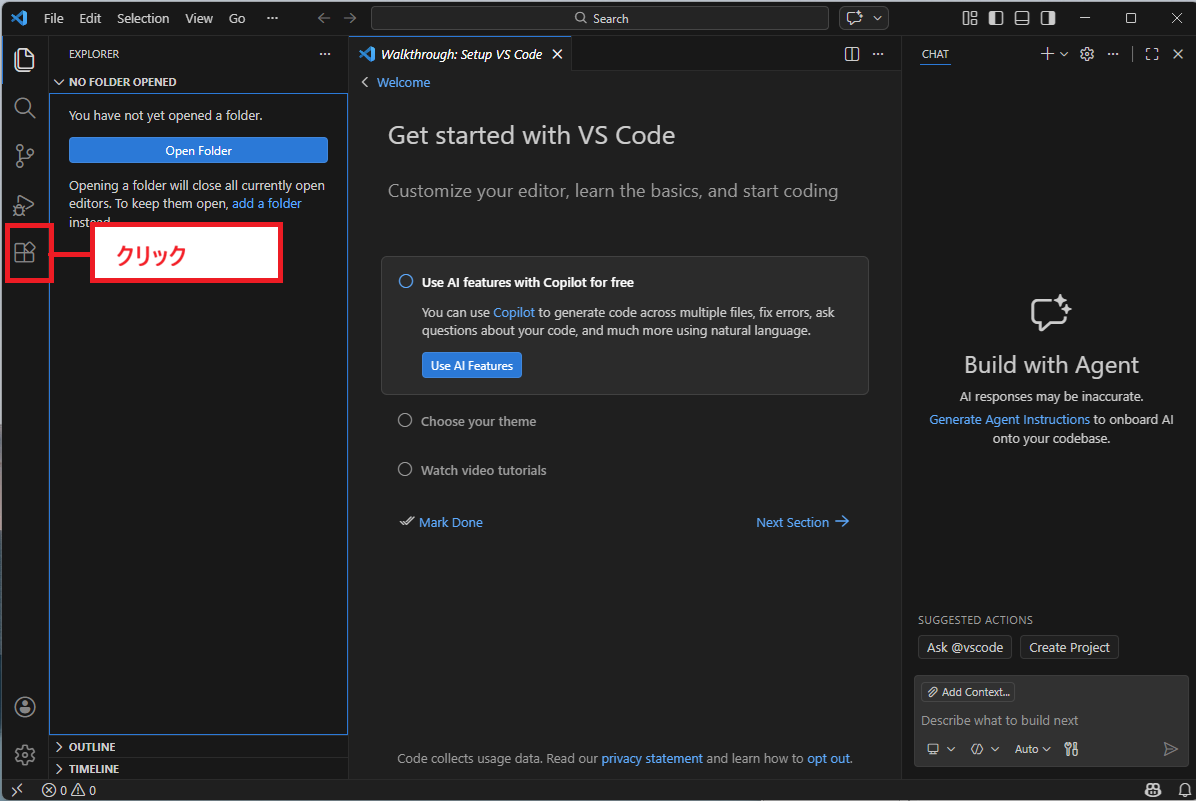 - VS Codeインストール後,表示されたWelcomeページ画面で左側に表示される「拡張機能」アイコンをクリックする(P.58 STEP1参照)