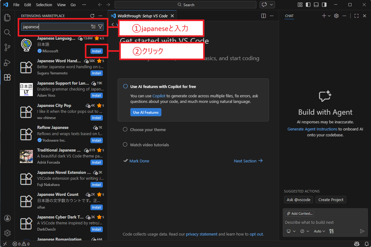 - 検索窓に「japanese」と入力し,表示される拡張機能一覧から[Japanese Language Pack for Visual Studio Code]を選び[Install]ボタンをクリックする
