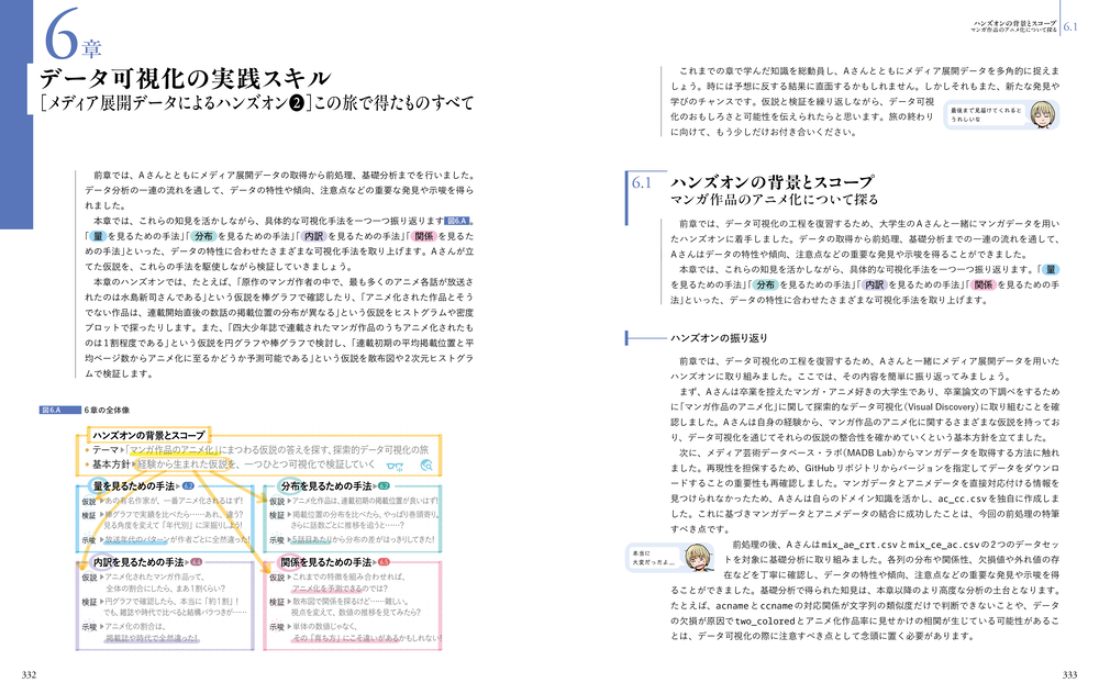 下巻は可視化手法のリファレンスと実践ハンズオンの二部構成です。最終的に「メディア展開」というテーマに解説を集約していきます。マンガ・アニメ・ゲームを筆頭に,コンテンツが発展・浸透する局面を考えると,メディア展開は,いま,そしてこれから先も,多くの人にとって関心のある重要なテーマの一つと言えるでしょう。さらには,業界を限定せず,複数の領域を横断しながら目の前の現実や予測を描き出す力・技術は,まさにいま注目を集めているスキルです。