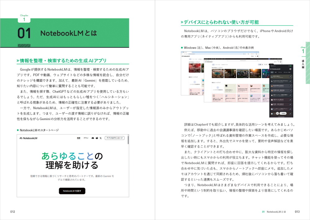 本書では,最強の生成AI アプリ「NotebookLM」を徹底解説。全部で4つのChapterから構成されており,導入編では概要を,基本編では各機能の使用方法を紹介します。